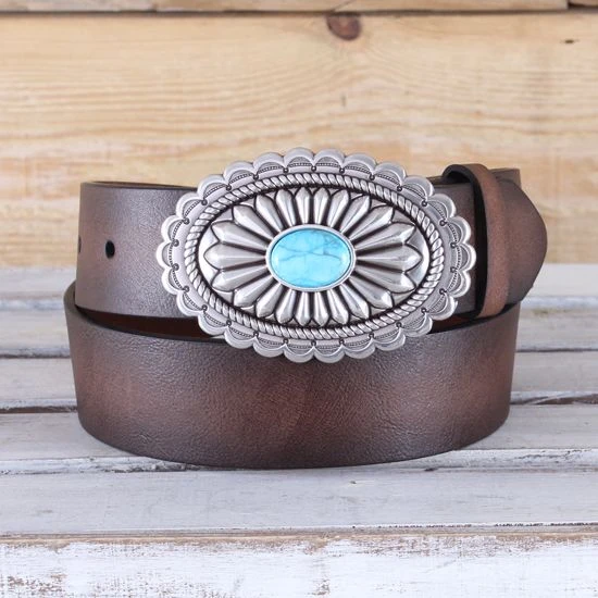 Accessorize with your favorite western gemstone, turquoise, with this chestnut belt from Ariat that features a southwestern bright silver finish buckle with a central dyed turquoise stone!