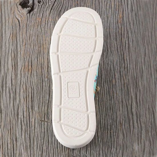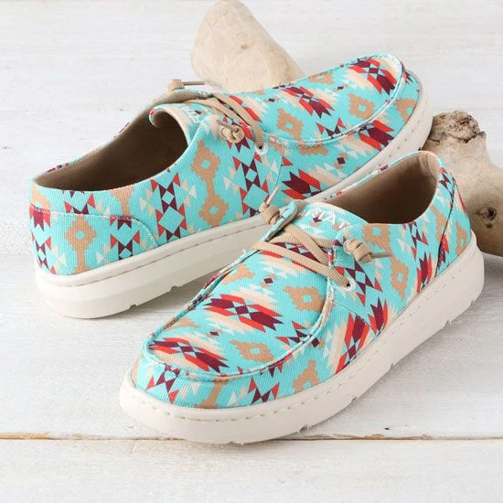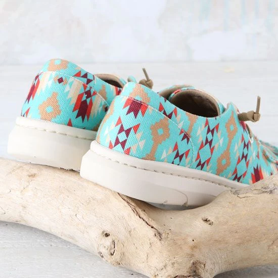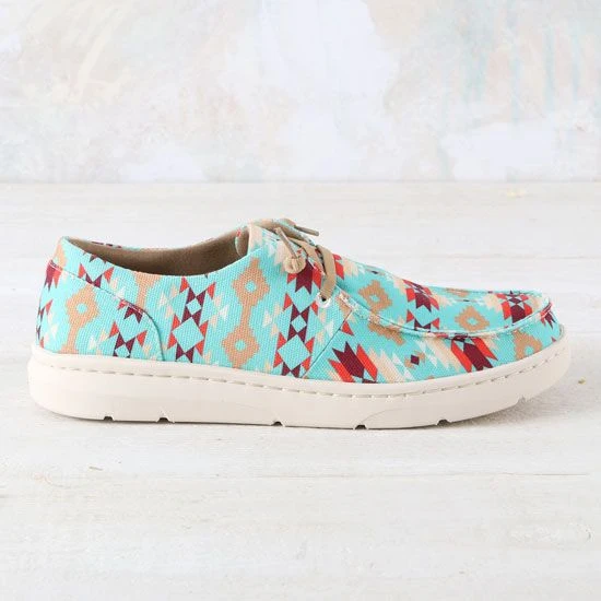 A fun, bright turquoise saddle blanket pattern in the ultra cushy and super comfortable Hilo from Ariat. The kind of shoe you can just throw on and go.