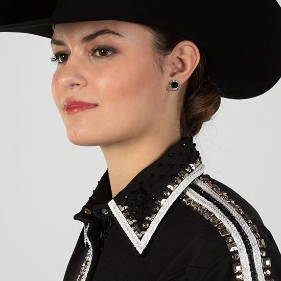 Want a little extra bling on your blouse, look no further. The Black and White Rhinestone Zip Front Blouse provides a classic look with some extra shine to get you noticed.