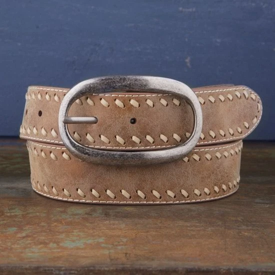 The Buckstitch Vintage Leather Belt features a worn leather look with a buckstitch trim and oval shaped silver tone buckle