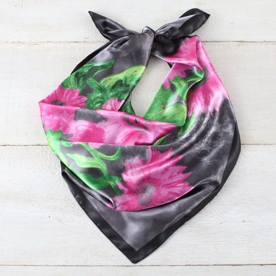The fuchsia and green colors contrast beautifully on the charcoal background of the Catcus Blossom Wild Rag.
