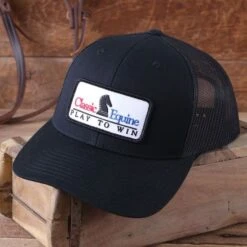 Classic Equine Embroidered Patch Black Ball Cap has a mesh back and snap closure.