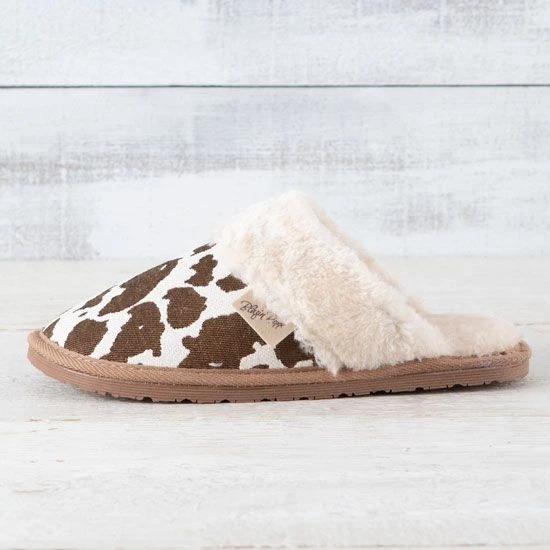Stay cozy in these cute Cowprint Chloe Slippers this season!