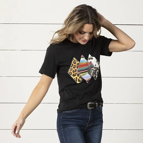 The Diamond Trio Tee has features of cow print, leopard print, serape and a cactus that will be sure to make it your new favorite top.