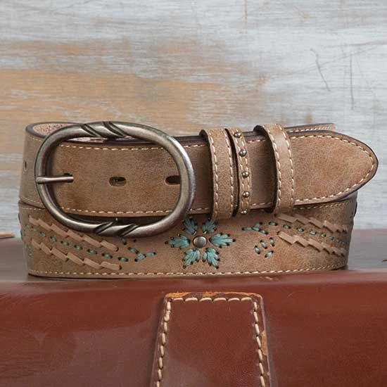 This belt will become your new favorite with its distressed design, buckstitch and light blue flower and swirl stitch design