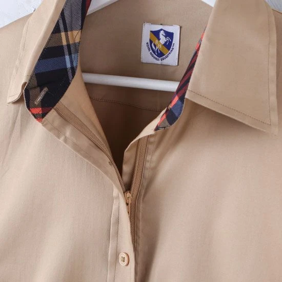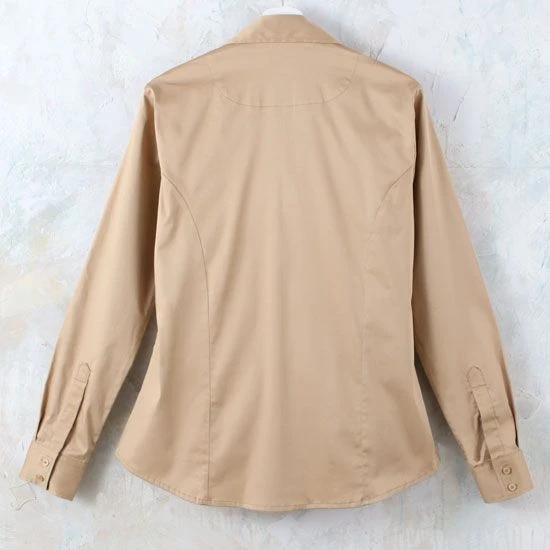 Are you sick of having to pin the button gap that always seems to happen when you wear that button down show top? No worries the Faux Button Zip Stretch Sateen Tan Show Top has a faux button front that hides a zipper closure!