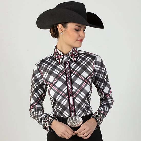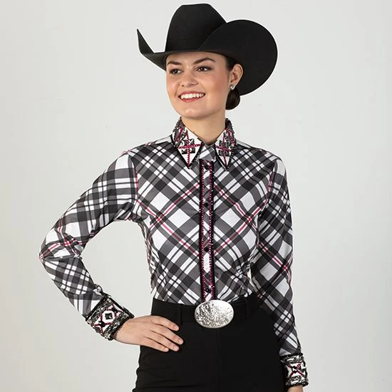 This beautiful Gray And Pink Bling Show Blouse pairs a nice plaid pattern, with bright pink and faux snakeskin detailing around collar and cuffs.