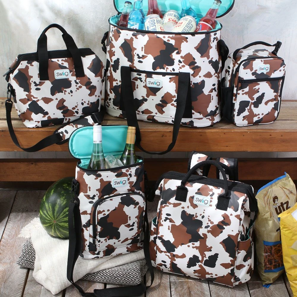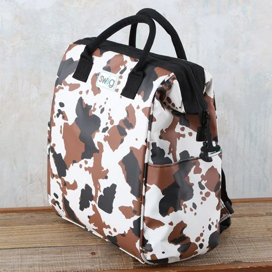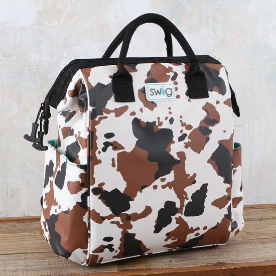Bring some western to-go with this charming cow hide print backpack cooler!