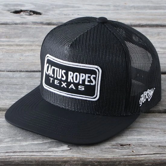 The Hooey CR75 Black Trucker Ball Cap features an all-over mesh design with a black and white Cactus Ropes patch on the front and embroidered Hooey logo on the side.