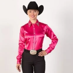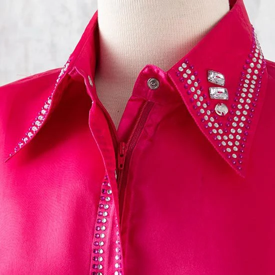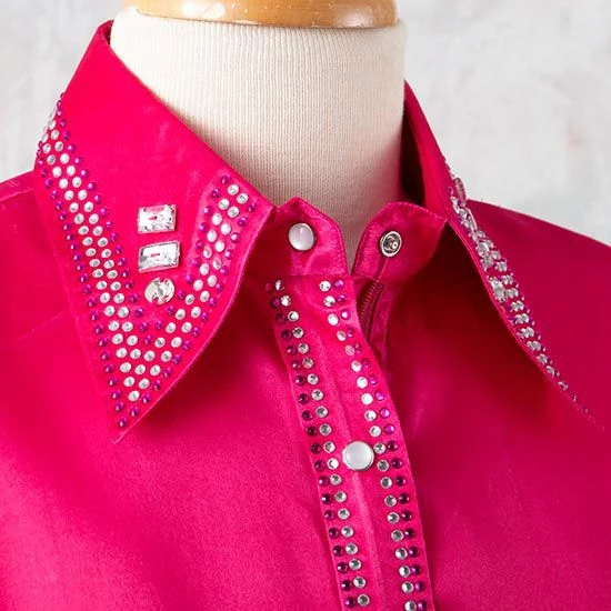 The Magenta Satin Faux Button Bling Show Top is a beautiful color that is sure to pair nicely with you horse in the show pen!