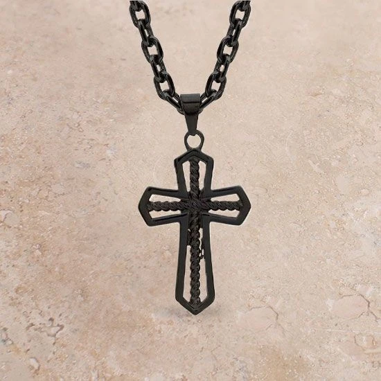 The Montana Silversmiths Gunmetal Cross Necklace is an open gunmetal black colored cross pendant necklace with an interior design of gunmetal black twisting rope that runs through each arm. The outside lines are a smooth line of the deep black color giving the necklace a modern, minimalist look.