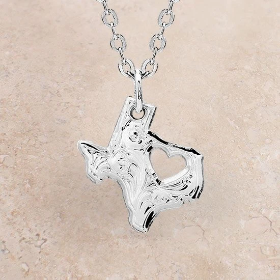 - A charming keepsake for natives and fans, this perfectly sized pendant in the shape of Texas is finished in bright silver and engraved in a traditional Western style