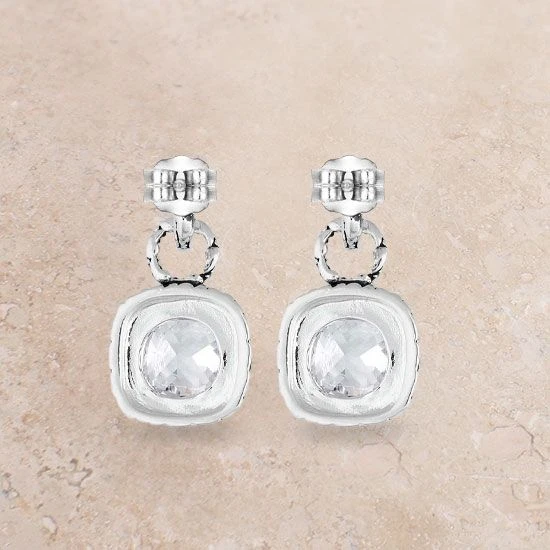 Nothing brings more joy than the gorgeous Western Delight Crystal Earrings. These earrings showcase a rounded square-shaped crystal surrounded by an intricately etched rope-like design that loops up and attaches to the post.