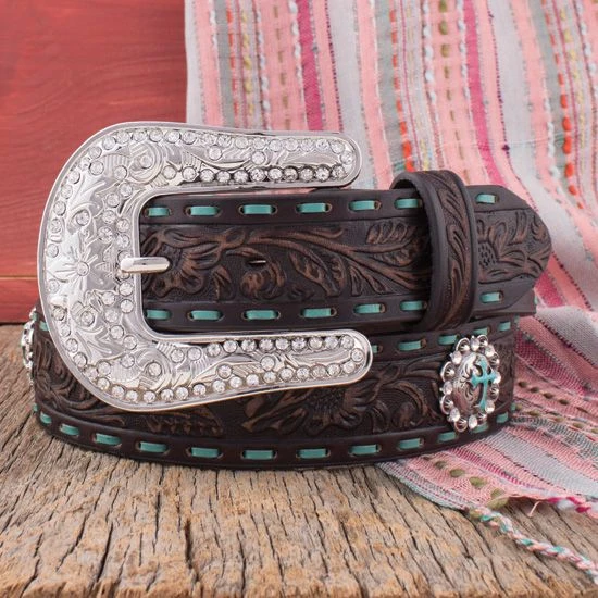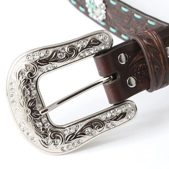 This classic tooled belt is distressed to show the floral pattern and accented by silver conchos