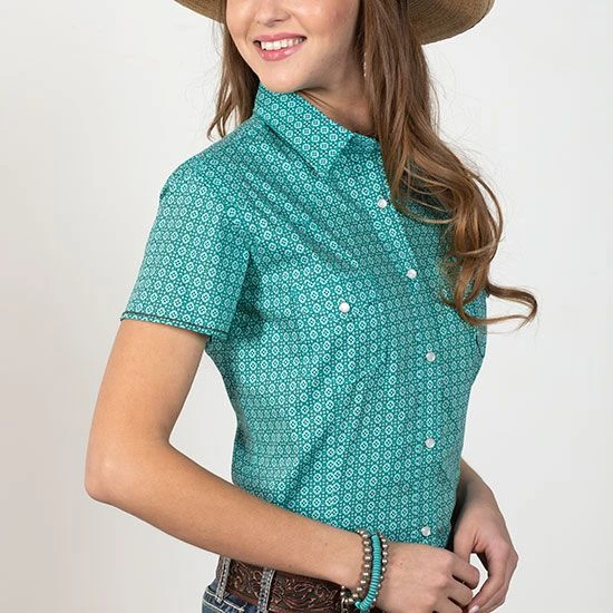 Grab a top that will have you feeling cool during those long show days. The Panhandle Roughstock Foulard Top is made for the working cowgirl, yet still provides you with that fitted look!