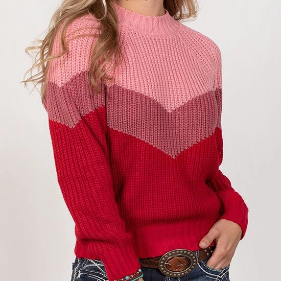 It does not get more comfortable than the Shades Of Red Chevron Sweater by Rock & Roll Cowgirl. Perfect to wear with your favorite pair of Rock & Roll Denim for an all-day lasting comfort and feel!