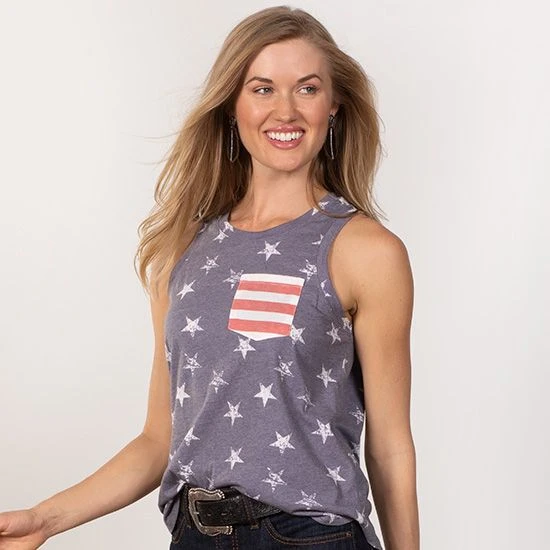 Show off your patriotic side with the Rock & Roll Cowgirl Star-Spangled Tank. Pair with your favorite style of Rock & Roll Denim and some patriotic Hey Dudes for the ultimate summertime look!