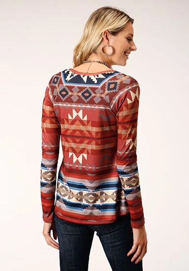Grab a sweater like jersey top with the Roper Aztec Rust Top!