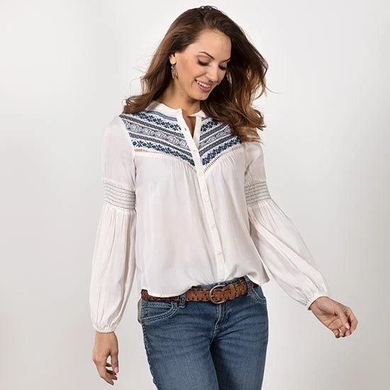 The Roper Pretty Peasant Button Down features a banded collar and slanted yokes with embroidery making it a great choice for your wardrobe.