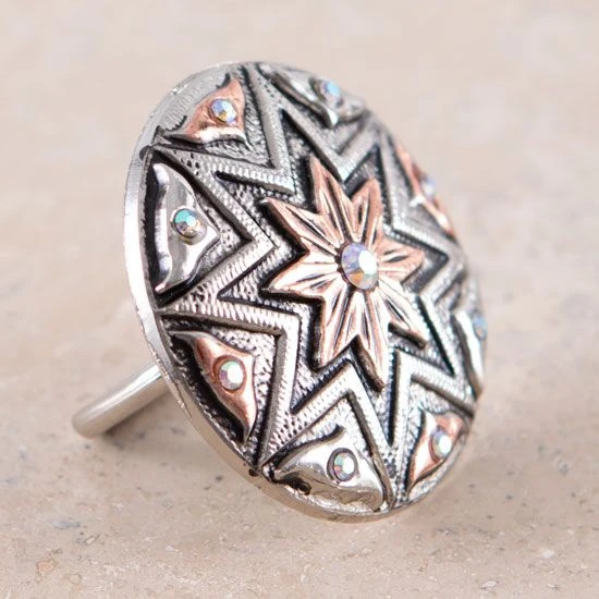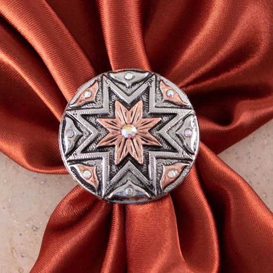 The Sunburst Aztec Scarf Slide is an unique western concho with a copper starburst style and AB crystals.