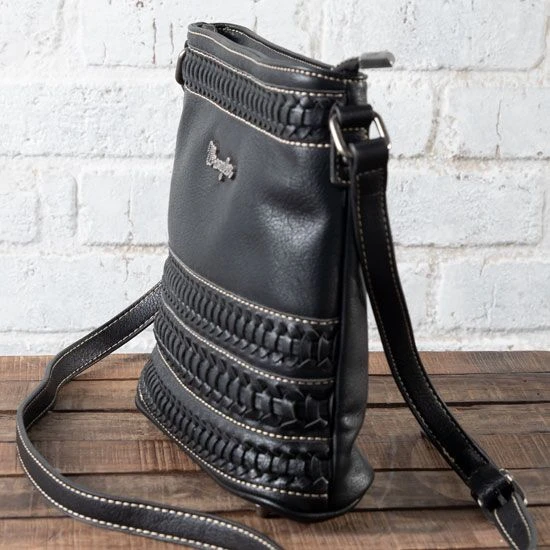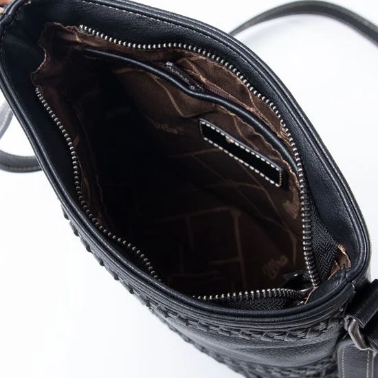 The Wrangler Black Stitch Concealed Carry Crossbody features intricate stitch detailing and a back concealed carry pocket and many interior pockets.