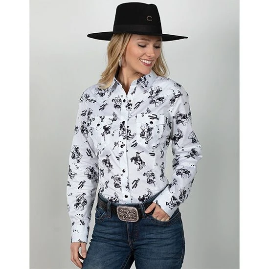 This pearl snap will keep you looking your best while giving a vintage feel in the arena! The Wrangler Riding In The Desert Blouse will be your new go to top!