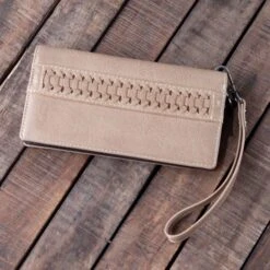 The Wrangler Tan Stitch Accent Wallet is made of PU leather and has a removable strap to convert the wallet into a wristlet.